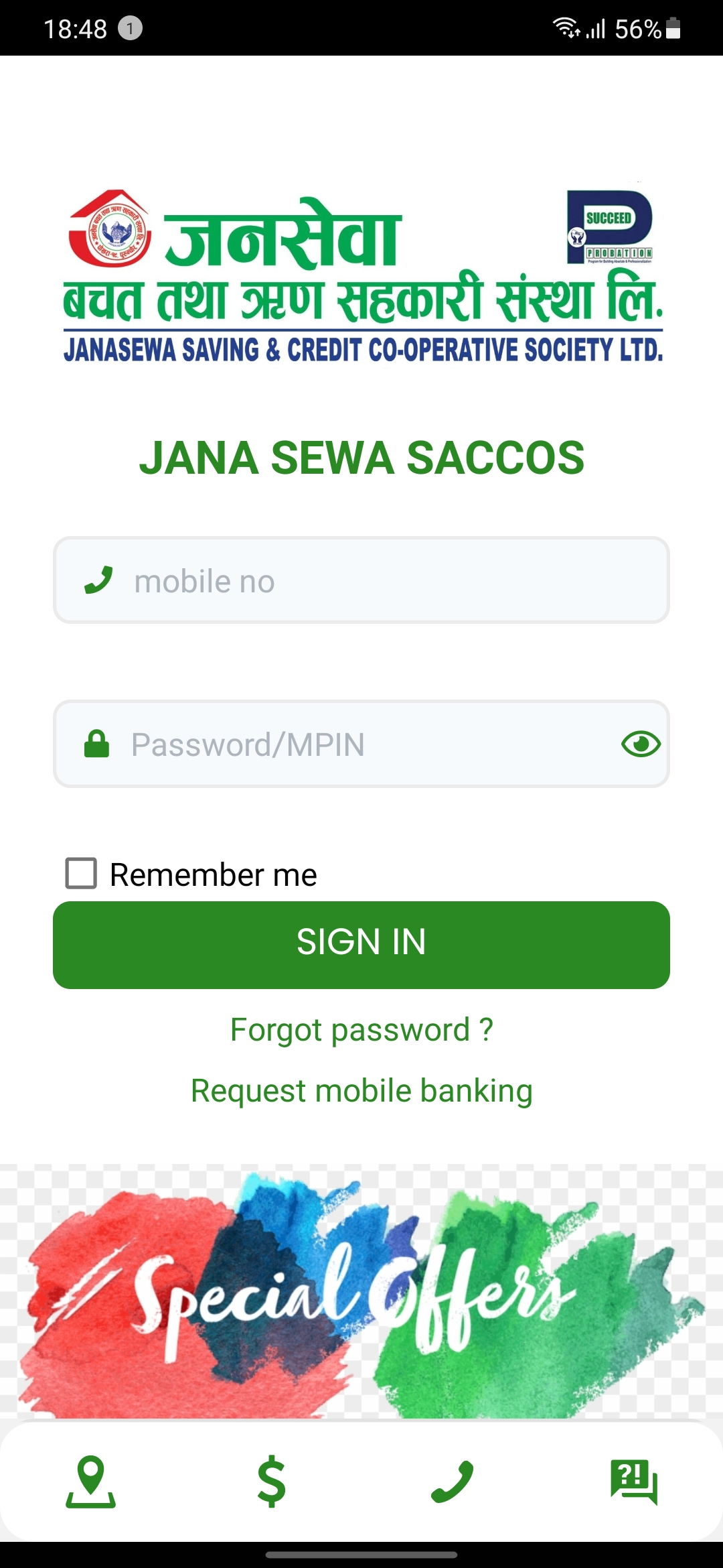 १. Playstore मा janasewa saving and credit खोज्ने र install गर्ने २. install गरिसकेपछि Apps open गर्ने ३. त्यसपछी Request mobile banking मा जानुहोला । ४. त्यसपछि आफ्नो पुरा नाम र संस्थामा आफ्नो सदस्य नं मा दर्ता भएको मोबाइल नम्बर राख्नुहोस् । ५. त्यसपछि Register मा click गर्नुहोस् । ६. संस्थामा सम्पर्क गरेर Approve गर्न लगाउनुहोस् । ७. संस्थाबाट Approve भएपछि तपाईको संस्थामा दर्ता भएको मोबाइलमा OTP कोड आउछ त्यसलाई मोबाइल एप्समा कोड मागेको ठाउमा type गर्नुहोस् अनि submit गर्नुहोस् । ८. त्यसपछि login मा जानुहोस् त्यहाँ मोबाइल नं र message मा आएको पासवर्ड टाइप गर्नुहोस् अनि signin गर्नुहोस् । ९. Signin गरिसकेपछी PIN राख्नुपर्ने हुन्छ ४ अंकको पिन नं राख्नुहोस् अनि Submit गर्नुहोस् ।